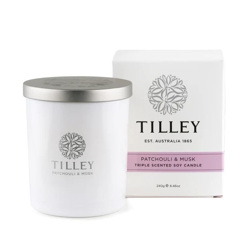 Tilley’s Patchouli Musk Soy Candles are carefully hand poured and crafted to the highest quality standards. Made from premium blended soy wax and lead-free cotton wick, this patchouli musk triple scented soy candle will burn cleanly for up to 45 hours. The classic Tilley white glass container adds an elegant ambiance to any decor. Please refer to inside the lid of the box for Candle Burning Instructions.
