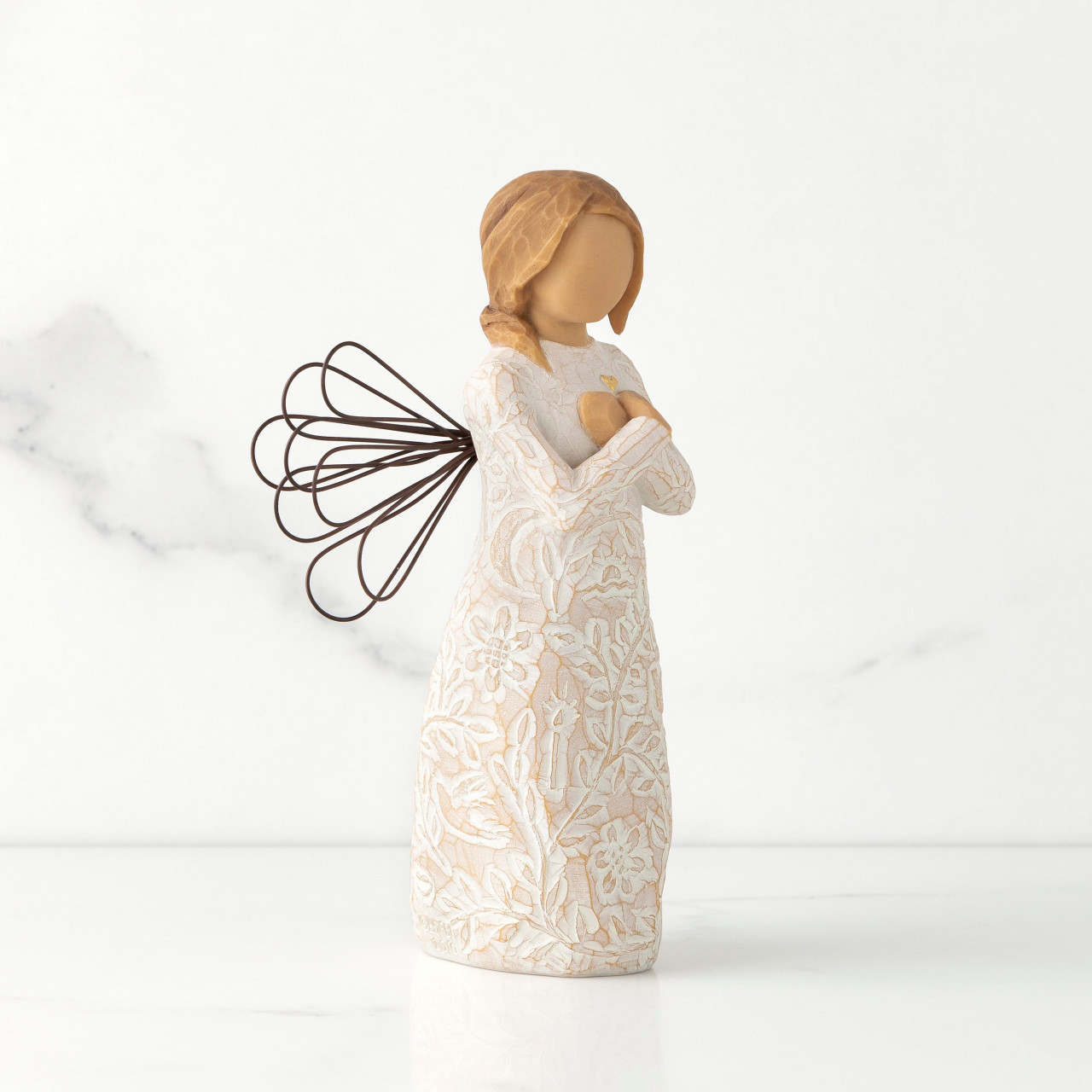 - Standing angel in cream dress with wire wings, with crossed hands under small gold-leaf heart. Dress carved with symbols of nature